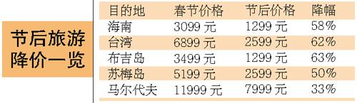 一路飆漲的旅游價(jià)格終于從今天開(kāi)始大幅跳水。來(lái)自各大旅行社的報(bào)價(jià)顯示,與春節(jié)黃金周相比,即日起節(jié)后整體旅游價(jià)格下降三至四成,最高降幅超過(guò)六成。其中降幅最大的是春節(jié)期間漲至萬(wàn)余元的三亞酒店房?jī)r(jià),節(jié)后跳水將近八成。