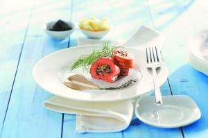 3.將保鮮膜鋪在工作臺上,將三文魚片放在保鮮膜上,蘑菇餡均勻地鋪在腌好味的三文魚片上,將魚卷成卷,放入烤盤,再在烤盤中加入適量的水,160度蒸烤30分鐘,烤好后取出放涼,切1cm片擺盤即可。信息時報記者 吳偉瑋