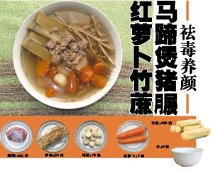 春季二三月是皮膚病和小兒麻疹好發(fā)季節(jié),此時(shí)最適合飲用紅蘿卜竹蔗馬蹄茅根水,它能祛麻疹病毒,涼血解毒、清熱養(yǎng)陰、滋養(yǎng)肌膚。今天加一塊豬 一起煲湯,增加甜香之余,還有健脾養(yǎng)胃功效,是男女老少皆宜的靚湯。