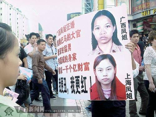 4月11日下午,一男子在南寧市裕豐商廈門前,舉出“廣西鳳姐征婚”的廣告牌,聲稱要為自己的一位親戚——“廣西版鳳姐”征婚!皬V西鳳姐”故作神秘沒現(xiàn)身,但其開出的征婚條件卻“雷倒”了眾多圍觀市民。