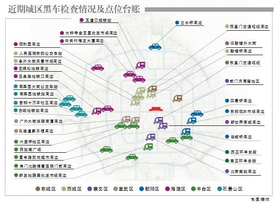 分布在“黑車地圖”上的128個(gè)重點(diǎn)地區(qū)中,東城6處、西城10處、崇文8處、宣武15處、朝陽(yáng)28處、海淀19處、豐臺(tái)33處、石景山9處。其中,豐臺(tái)、海淀和朝陽(yáng)三區(qū)的黑車分布點(diǎn)以絕對(duì)優(yōu)勢(shì)占據(jù)前三甲,總量占到近7成。