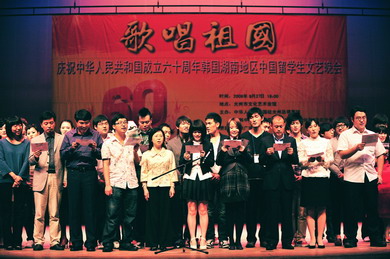中新網(wǎng)9月28日電 據(jù)外交部網(wǎng)站報道,9月27日傍晚,來自光州市、全羅南道、全羅北道共11所大學(xué)的700名中國留學(xué)生在此歡聚一堂,參加由駐光州總領(lǐng)館和在韓中國留學(xué)生聯(lián)合會光州全南分會、全北分會聯(lián)合舉辦的“歌唱祖國——慶祝建國60周年韓國湖南地區(qū)中國留學(xué)生文藝晚會”。