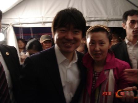 在大阪日本橋開辦四川料理店鳳家的中國(guó)女留學(xué)生汪哲有幸接到了邀請(qǐng)函,不但進(jìn)入了會(huì)場(chǎng),還坐在橋下知事很近的座位上,演出結(jié)束后,汪哲突然產(chǎn)生了一股勇氣,來(lái)到了橋下知事的身邊,她大膽地拉住了橋下知事的手,向橋下知事介紹了自己在大阪宣傳上海世博會(huì)的努力,橋下知事也被上海世博會(huì)的慶祝氣氛深深地感染了,顯得很有興趣地聽(tīng)完了汪哲的自我介紹;接著汪哲乘勝追擊邀請(qǐng)橋下知事與她合影留念,并留下了珍貴的紀(jì)念照片。