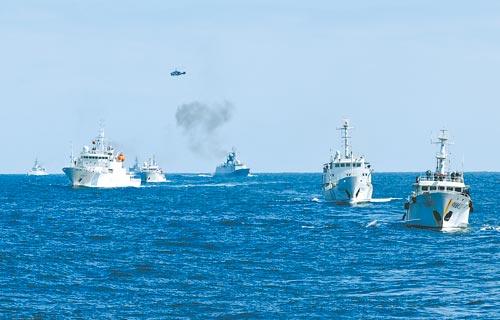 10月19日,中國(guó)海監(jiān)、漁政船只在中國(guó)海軍艦艇、飛機(jī)的支援掩護(hù)下進(jìn)行航渡。向南攝