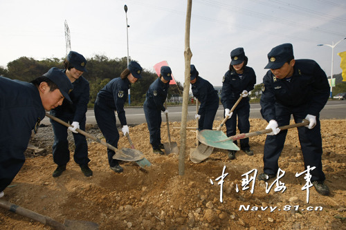 11月6日,東海艦隊某水警區(qū)20名官兵來到駐地經(jīng)濟開發(fā)區(qū)開展軍民秋季綠化植樹活動。寒風中官兵們奮戰(zhàn)半個多小時,300顆左右的樹木挺立在荒蕪的土地上,頓時變得生機盎然起來。拍下身上的塵土,大家紛紛表示能在喜迎黨的十八大之際,為建設第二故鄉(xiāng)貢獻力量,很開心。