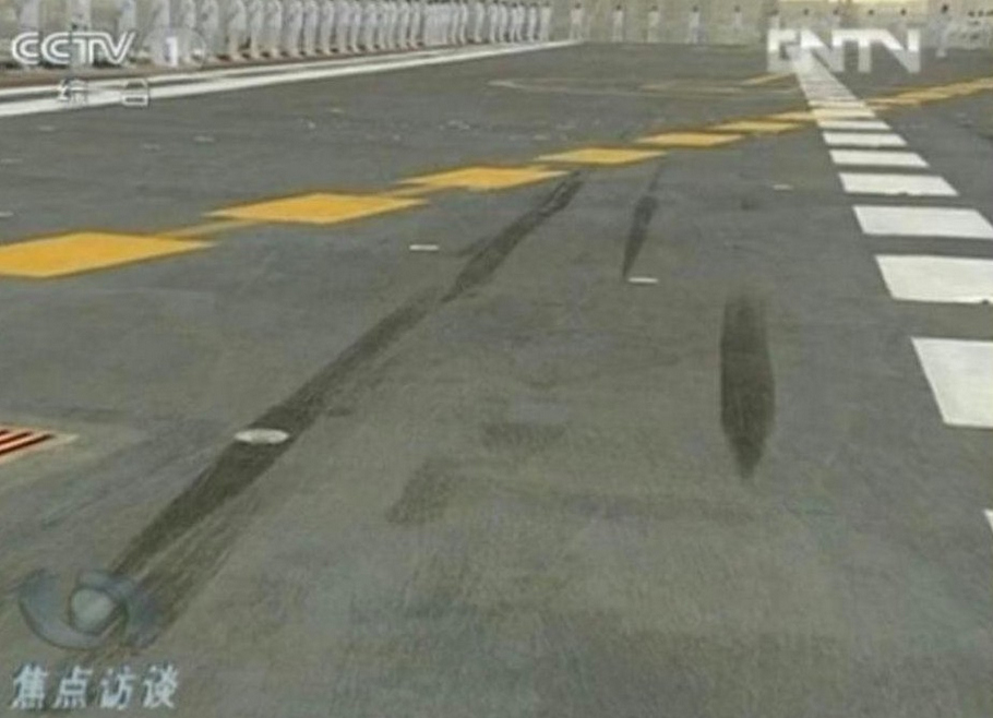 甲板上清晰的艦載機(jī)留下的輪胎印。(央視截圖)