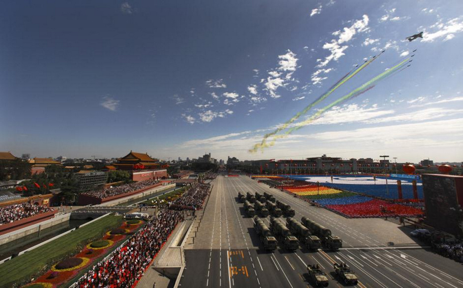 2009年10月1日,慶祝中華人民共和國成立60周年首都閱兵式上,多機編隊的領(lǐng)隊梯隊飛過天安門廣場。新華社記者 費茂華 攝