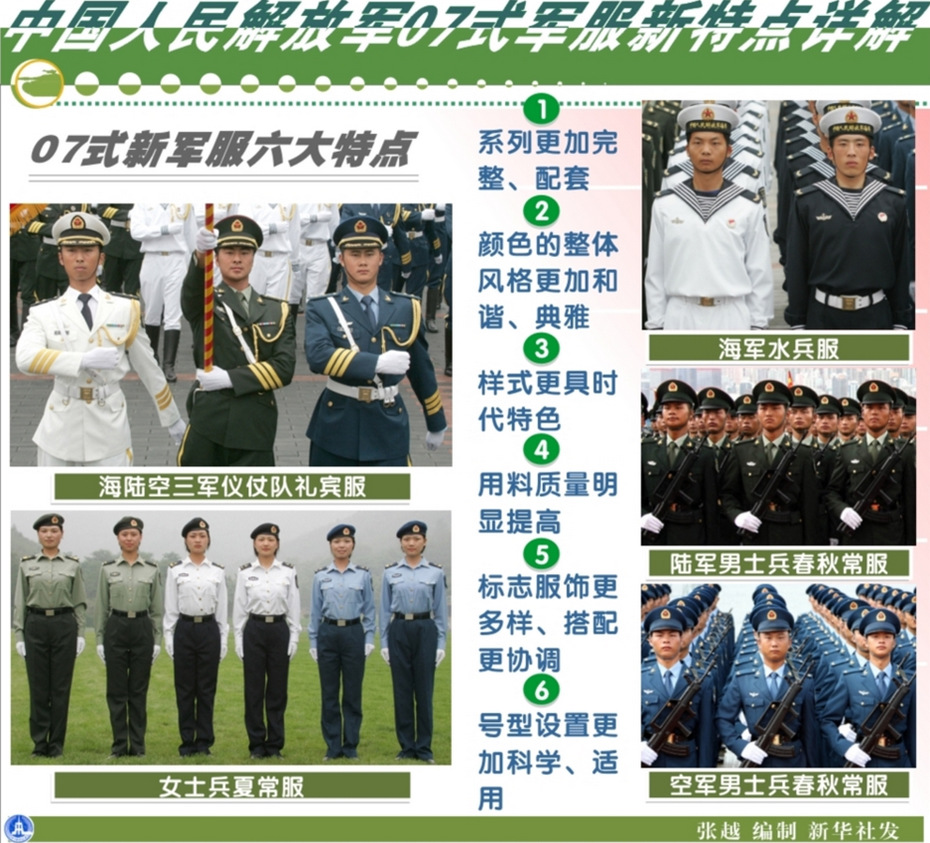 這是中國人民解放軍07式軍服新特點(diǎn)詳解的圖表。2007年7月起,全軍官兵陸續(xù)穿上07式軍服。這次我軍歷史上規(guī)模最大最系統(tǒng)的換裝,涉及禮服、常服、作訓(xùn)服和標(biāo)志服飾4個(gè)系列700多個(gè)品種。新華社發(fā)