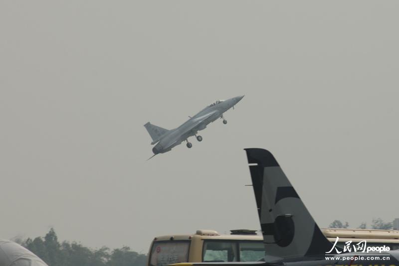 梟龍戰(zhàn)機起飛進行飛行表演。人民網(wǎng)記者 閆嘉琪 攝