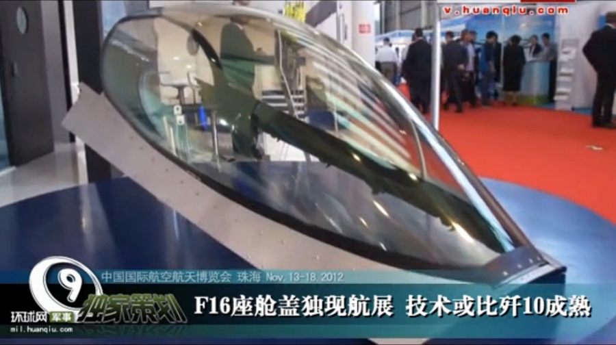 參展商英國漢堡森航空航天公司展出的F-16一體成形座艙罩(環(huán)球網視頻截圖)