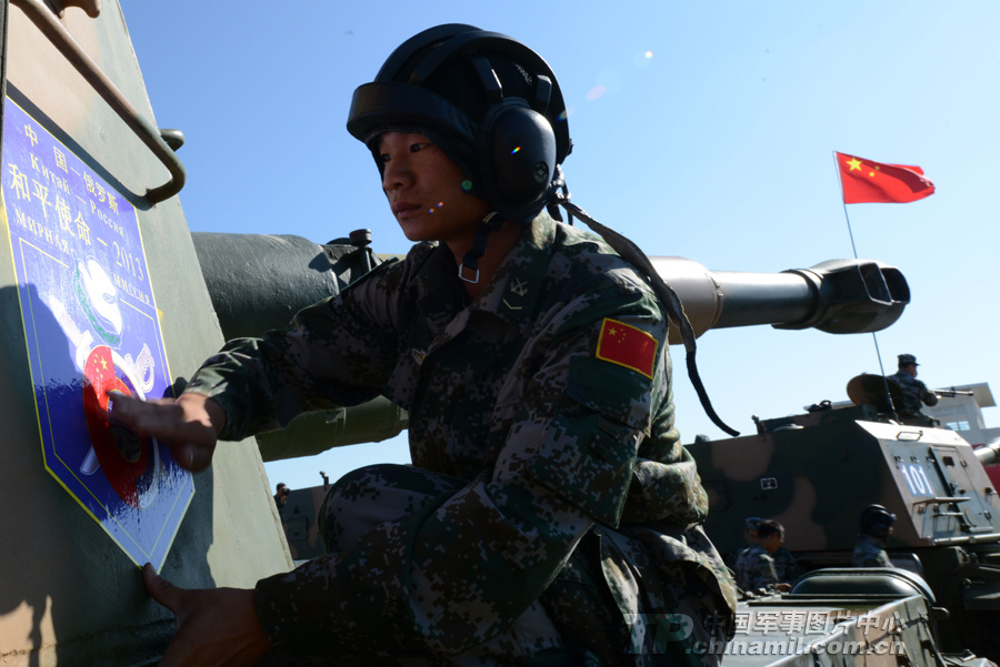 一名戰(zhàn)士給將要出征的戰(zhàn)車貼上演習(xí)圖標(biāo)