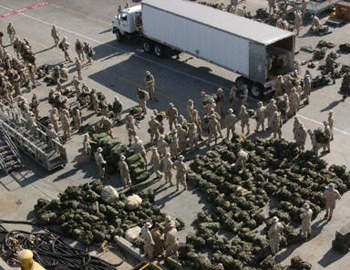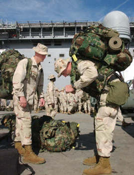 一支美海軍陸戰(zhàn)隊(duì)遠(yuǎn)征部隊(duì)正準(zhǔn)備從加利福尼亞圣地亞哥海軍港口,乘坐“好人理查”號兩棲攻擊艦前往波斯灣。與此同時,還將有六艘兩棲艦負(fù)責(zé)運(yùn)送其它作戰(zhàn)單位一同前往。