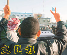 數(shù)百名伊拉克記者聚集在運(yùn)河酒店門(mén)外,在一九九一年海灣戰(zhàn)爭(zhēng)周年舉行抗議活動(dòng)。于海灣戰(zhàn)爭(zhēng)中,伊拉克部隊(duì)占領(lǐng)了科威特七個(gè)月后,被以美國(guó)為首的盟軍驅(qū)逐出科威特。