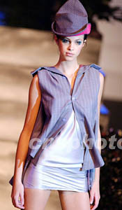 在香港舉辦的“香港青年時裝設(shè)計家創(chuàng)作表演賽2003”上,模特展示青年時裝設(shè)計師楊展的獲獎作品。洪少葵 攝
