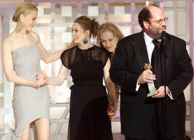 圖為《時(shí)時(shí)刻刻》獲得金球獎(jiǎng)劇情類最佳電影獎(jiǎng),從左至右為:妮可·基德曼、茱麗安·摩爾、梅麗爾·斯特里普與制片人斯科特陸丁。