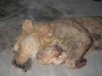 為了配合公安機(jī)關(guān)偵查,李滿堂將已經(jīng)包裹好的獅子尸體重新打開,從獅子的表情可以看出死時(shí)很痛苦,李滿堂說,大約在最近幾天,他便發(fā)現(xiàn)籠中的兩頭獅子有些不對(duì)勁,整日無精打采,不愛吃食。開始以為獅子患了感冒,給獅子吃了些消炎藥,但隨后兩天獅子仍然不見好而且厭食情況一天比一天嚴(yán)重,并開始出現(xiàn)嘔吐癥狀,隨后公園工作人員將嘔吐物送至丹東市動(dòng)物檢疫站化驗(yàn)。