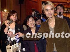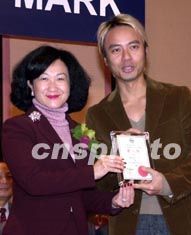 歌星李克勤1月21日在香港出席“第五屆香港安全標(biāo)志證書頒獎(jiǎng)典禮”,他從香港特區(qū)保安局局長葉劉淑儀手中接過委任狀,成為2003年度之“產(chǎn)品安全大使”,將協(xié)助宣揚(yáng)產(chǎn)品安全訊息。中新社傳真 鄧慶樂 攝