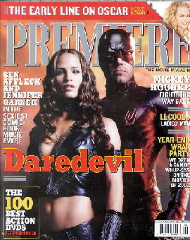 據(jù)臺灣媒體報道,耗資一億美金、改編自Marvel暢銷漫畫的《夜魔俠》,由班艾佛列克及金獎影后珍妮佛嘉納,分飾片中靈魂人物夜魔俠及伊萊莎。除了媲美《蜘蛛人》的視效動作,片中男女主角感情的糾結(jié),更可媲美《英雄》里的殘劍飛雪,這對漫畫世界里愛得辛苦,卻也天地可表的戀人,搬上大銀幕將如何詮釋,早已掀起熱門話題。不僅全美檔期刻意安排在情人節(jié)上片,班艾佛列克和珍妮佛嘉納兩人更以緊身衣造型相繼入鏡,榮登二月號《首映雜志》的封面照,這是《首映雜志》繼二00一年十一月《哈利波特:神秘的魔法石》后,再度讓封面人物以戲服登場,雜志內(nèi)文還以八頁超大篇幅完整介紹,不僅印證了暢銷漫畫《夜魔俠》的人氣和辨識度,也令這部電影備受矚目。