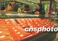 受國際黃金價格連創(chuàng)新高影響,近日,鄭州各商場的黃金首飾價格又攀新高,不少柜臺都標到了每克128元,創(chuàng)出幾年未見的高價格。馬健 攝