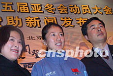 中國代表團出征第五屆亞冬會動員大會二十七日在北京舉行,冬奧會冠軍楊揚成了新聞媒體及與會人員追逐的熱點。圖為與會人員爭相與楊揚合影留念。作者:武仲林