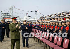 中央軍委授予海軍哈爾濱艦“海上先鋒艦”榮譽稱號命名大會二十六日在青島某軍港舉行?傉尾、海軍及艦隊領(lǐng)導(dǎo)看望哈爾濱艦官兵。作者:王松岐