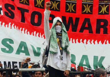 9日在印尼雅加達爆發(fā)大規(guī)模反美反戰(zhàn)示威,超過5000名穆斯林走上街頭,在美國大使館外抗議美國準備對伊拉克使用武力。