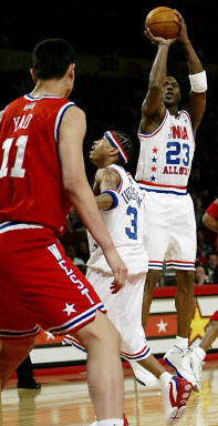 上半場,東部的首發(fā)名單有所改變:奇才隊的喬丹,頂替了此前曾經(jīng)表示不會把首發(fā)位置讓給他的卡特,在東部聯(lián)盟中首發(fā)?ㄌ厥菃痰ね淮髮W的師弟,此前曾經(jīng)拒絕把首發(fā)名額交給喬丹。不過在關(guān)鍵時刻,他還是讓師兄為東部首發(fā)。東部隊的其他首發(fā)隊員是艾弗森(76人隊)、麥克格雷迪(魔術(shù)隊)、小奧尼爾(步行者隊)、本-華萊士(活塞隊)。