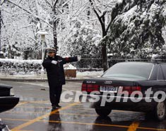 一場冷雨之后,十一日紛飛的大雪籠罩了南京城。為了保障市內(nèi)交通順暢,交巡警上路值勤,指揮交通。作者:丁東升