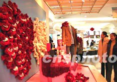 情人節(jié)將近,北京中友商廈將上百只毛絨小熊組成紅白兩顆愛(ài)心吸引顧客。作者:廖文靜