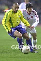 中國(guó)隊(duì)遂展開(kāi)反撲,在此后的十五分鐘內(nèi)連續(xù)獲得多次攻門良機(jī)。最佳機(jī)會(huì)出現(xiàn)在四十分鐘,當(dāng)時(shí)孫繼海左路拉開(kāi)巴西隊(duì)防線,邊路傳中,禁區(qū)內(nèi)的李毅在無(wú)人防守的情況下,竟然頭球射門偏出。喪失了最好破門機(jī)會(huì)的中國(guó)隊(duì),只好與巴西隊(duì)平局結(jié)束上半場(chǎng)。