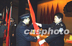 十四日,北京警方舉行治安系統(tǒng)“兩會”安全保衛(wèi)動員大會,公安局長馬振川(右)為“兩會”治安保衛(wèi)突擊隊(duì)授旗。作者:任海霞