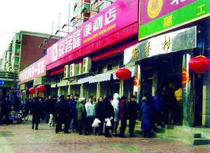 中午1點10分,記者在勁松橋西北角的稻香村分店門口看到,排隊的顧客有180多人,隊伍一直向西遮擋了該店隔壁兩家店鋪的街面,蜿蜒到了一棟宿舍樓前。排在最后的顧客已經開始聊天解悶。商店門口的柱子上則貼著“每人限購4斤”的告示,兩名男營業(yè)員站在柜臺外維持秩序,正在買元宵的顧客說,自己9點多就排上了,都快沒信心了才輪到。