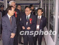 國(guó)務(wù)院副總理錢其琛(左一)、全國(guó)政協(xié)副主席羅豪才(左二),十五日在泉州饒有興致地觀看二十世紀(jì)華僑華人圖片展。作者:劉可耕
