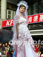 二月十六日,北京西單一家婚紗影樓借情人節(jié)刮起的浪漫旋風(fēng),不失時機(jī)地舉辦了一場婚紗秀,吸引了不少觀眾。作者:杜洋