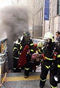 圖:韓國救援人員搶救地鐵縱火案傷員