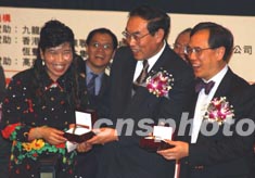 由香港九家媒體聯(lián)合主辦的“2002年特區(qū)政府施政十件大事”評(píng)選頒獎(jiǎng)禮,二月十九日在中央圖書(shū)館舉行。圖為香港中聯(lián)辦副主任王鳳超(中)、特區(qū)政務(wù)司司長(zhǎng)曾蔭權(quán)(右)向榮獲一等獎(jiǎng)的投票讀者馮明嬌女士頒獎(jiǎng)。中新社傳真 潘索菲 攝