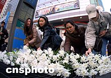 2月19日,韓國(guó)大邱群眾自發(fā)地將鮮花放在2月18日地鐵縱火案的事發(fā)現(xiàn)場(chǎng),寄托哀思,悼念死難者。Ic/cnsphoto 攝