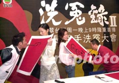 劇中藝員歐錦棠、滕麗名、佘詩(shī)曼、歐陽(yáng)震華(左起)于會(huì)上以口代手寫上"冤"字比拼,場(chǎng)面搞笑。