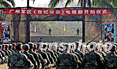 中國(guó)第一部全方位表現(xiàn)解放軍參加國(guó)際偵察兵軍事技能大比武的電視連續(xù)劇《世紀(jì)突擊》,二月二十二日在海南五指山某軍事基地開拍。圖為壯觀的開拍儀式。作者:古月