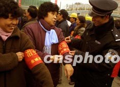 北京市東城警方二十四日舉行“警民聯(lián)防保安全”大會,發(fā)動群眾協(xié)助警方做好“兩會”安全保衛(wèi)工作。目前北京市已有四萬多名“紅袖標”在街道、社區(qū)巡邏值勤。作者:宋吉河