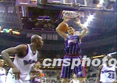 加時五分鐘,姚明的一次勾手投籃曾讓火箭以九十二比九十反超,但他的一次失誤和一次犯規(guī),又令奇才抓住機會。最終奇才隊靠喬丹的神勇表現(xiàn),終以兩分鎖定勝局。