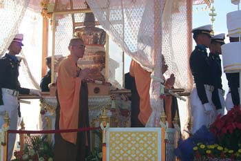 今天早上,泰國(guó)曼谷空軍機(jī)場(chǎng)舉行了隆重的送歸儀式。泰國(guó)文化部長(zhǎng)烏萊婉致詞,她以泰國(guó)政府、佛教界和全國(guó)人民的名義,衷心感謝中國(guó)政府為慶祝泰國(guó)國(guó)王陛下75圣壽大吉,同意佛牙舍利自2002年12月15日至2003年2月28日共76天,赴泰佛統(tǒng)府佛教城臨時(shí)供奉76天。她說,供奉期間,泰國(guó)人民前往佛教城舉行各種各樣的參拜活動(dòng)。泰國(guó)王儲(chǔ)殿下于1月9日代表國(guó)王陛下前往參拜,泰國(guó)佛教最高領(lǐng)袖僧王兩次參拜,泰國(guó)樞密院主席、國(guó)會(huì)主席、上議院主席、內(nèi)閣主要領(lǐng)導(dǎo)人以及眾多議員都前往參拜。在佛牙舍利臨時(shí)赴泰供奉事宜圓滿成功之際,泰國(guó)政府對(duì)中國(guó)政府和人民以及中國(guó)佛教協(xié)會(huì)表示衷心的感謝,并祝愿泰中友好萬(wàn)古長(zhǎng)青。