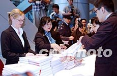 匯豐股控有限公司3月3日公布2002年全年業(yè)績(jī),傳媒爭(zhēng)先在記者會(huì)上領(lǐng)取匯豐股控有限公司2002年全年業(yè)績(jī)報(bào)告,以第一時(shí)間發(fā)布新聞。洪少葵 攝