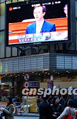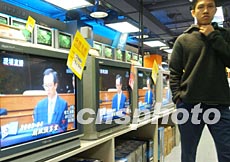 素有購物天堂美譽(yù)的香港,商家關(guān)注稅務(wù)制度改革。三月五日公布的香港2003至2004年度財政預(yù)算案成為此間商家關(guān)注熱點,圖為電器店里的電視機(jī)播出財政司司長梁錦松提交的預(yù)算報告。潘索菲 攝