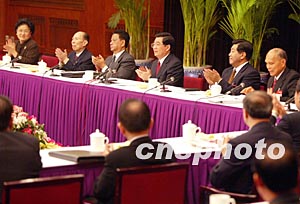 中共中央總書記胡錦濤今天上午來到全國政協(xié)禮堂會議室,親切看望了出席全國政協(xié)十屆一次會議的港澳地區(qū)政協(xié)委員,并參加了他們的聯(lián)組討論。中共中央政治局常委賈慶林參加了看望和聯(lián)組會議。