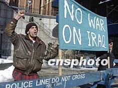 當(dāng)?shù)貢r(shí)間三月七日上午,安理會(huì)關(guān)于伊拉克問(wèn)題部長(zhǎng)級(jí)公開(kāi)會(huì)議在紐約聯(lián)合國(guó)總部舉行。圖為反戰(zhàn)人士在聯(lián)合國(guó)總部門前高呼反對(duì)對(duì)伊動(dòng)武的口號(hào)。作者:陳建