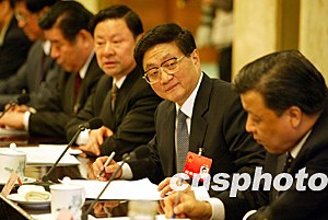 中新社北京三月八日電中共中央總書記胡錦濤和其他幾名中共中央政治局常委曾慶紅、黃菊、吳官正、李長春,今天下午分別參加了十屆全國人大一次會(huì)議江蘇、浙江、內(nèi)蒙古、山西、河南代表團(tuán)的審議。