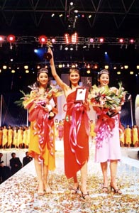 由中國(guó)服裝設(shè)計(jì)師協(xié)會(huì)、全國(guó)紡織教育學(xué)會(huì)、石獅市人民政府聯(lián)合主辦,中國(guó)職業(yè)時(shí)裝模特委員會(huì)承辦的“愛(ài)登堡”杯第三屆中國(guó)職業(yè)時(shí)裝模特選拔大賽總決賽,于8日晚上在福建省石獅市體育館隆重進(jìn)行。經(jīng)過(guò)四輪的時(shí)裝演繹,最終,來(lái)自青島東方麗人模特培訓(xùn)藝術(shù)學(xué)校的戴小奕小姐榮獲冠軍。圖為獲前三名的選手:左起為季軍孫玉琦、冠軍戴小奕、亞軍薛婧。石勇 攝