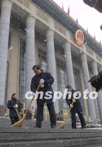 中新社北京三月十日電(記者吳慶才)“北國二月難覓花,飛雪飄飄灑京華”。十日清晨的一場飛雪給正在召開兩會的北京又增添了一份喜慶。