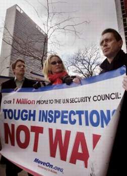 這份包括60萬美國人的簽名請愿書呼吁聯(lián)合國安理會繼續(xù)對伊拉克進(jìn)行武器核查以避免戰(zhàn)爭。名叫“蠃得勝利,不用戰(zhàn)爭”的聯(lián)合會表示,他們希望通過這些安理會常任理事國代表向各自國家政府傳遞這樣一個信息:薩達(dá)姆·侯賽因可以在避免戰(zhàn)爭的情況下被監(jiān)督。他們這么做,旨在為聯(lián)合國核查人員爭取必要的時間以完成自己的職責(zé),而并不是請求什么不可實現(xiàn)的東西。